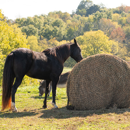 - 2 String square bales (50-60lbs) last about 48 hours with 2 horses.